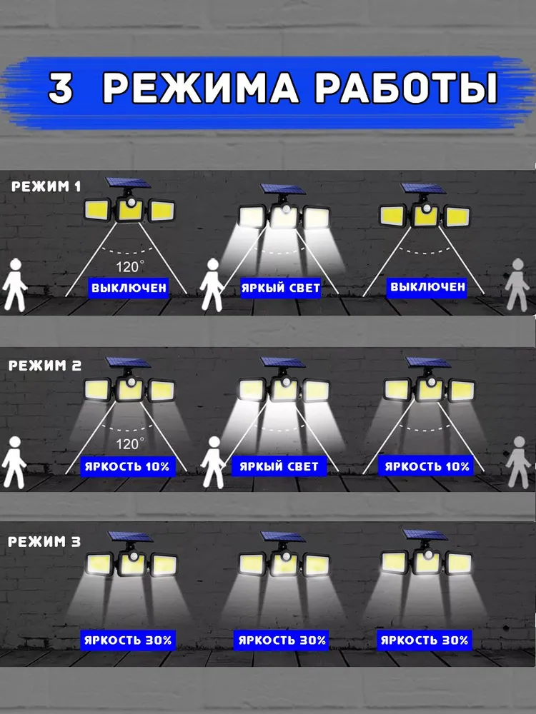 3. Постоянная работа на 50% яркости при наступлении темноты. Светильник работает в режиме пониженной яркости на 50 % независимо от физического движения в зоне действия датчика. Время работы при полной зарядке аккумулятора до 15 часов. Время работы зависит от зарядки аккумулятора.